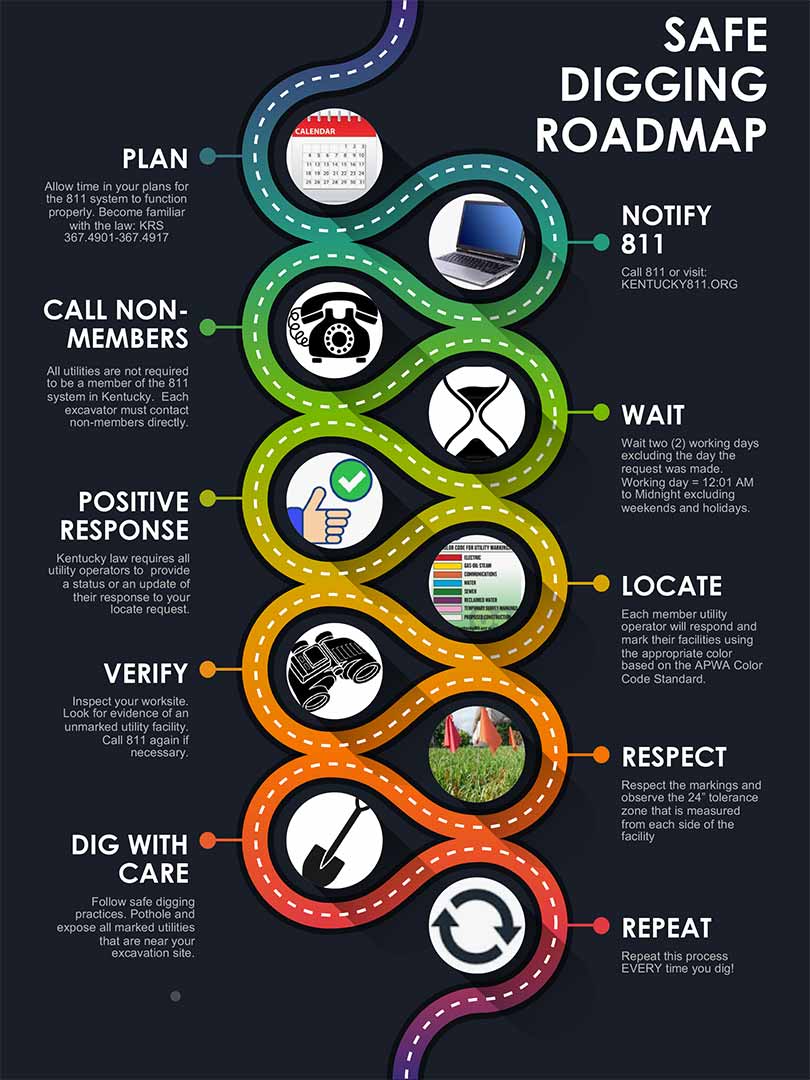 Once your locate request is received, Kentucky 811 will notify member utilities that own facilities in the area of your dig site. You are responsible for contacting non-members and having any private lines at your dig site marked. Private utilities may include lawn sprinkler systems, security lighting, or natural gas grills. A private locator must be hired to mark private lines.
