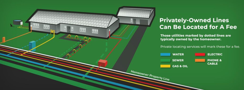 A good general rule of thumb is if the utility runs from the street to the meter, it will be marked. If the utility is installed from the meter to another location on the property, it will not be marked. Click here to learn more about private utilities.